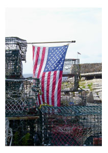 A bit of Americana - the flag set amongst a stack of lobster traps. |